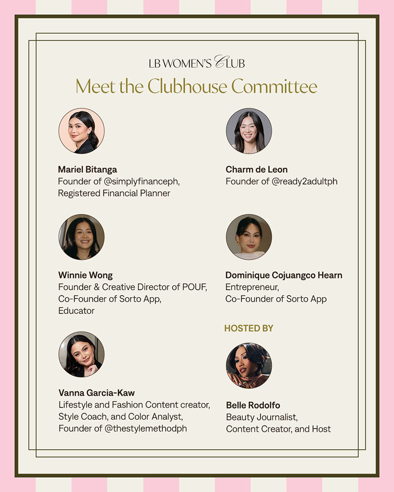 Speakers include Mariel Bitanga, founder of @simplyfinanceph, on financial education; Charm De Leon, founder of @ready2adultph, on personal finance and entrepreneurship; Winnie Wong and Dominique Cojuangco Hearn, founders of Sorto, an AI‑powered wardrobe app, and Vanna Garcia, style coach and content creator, on personal styling and confidence.